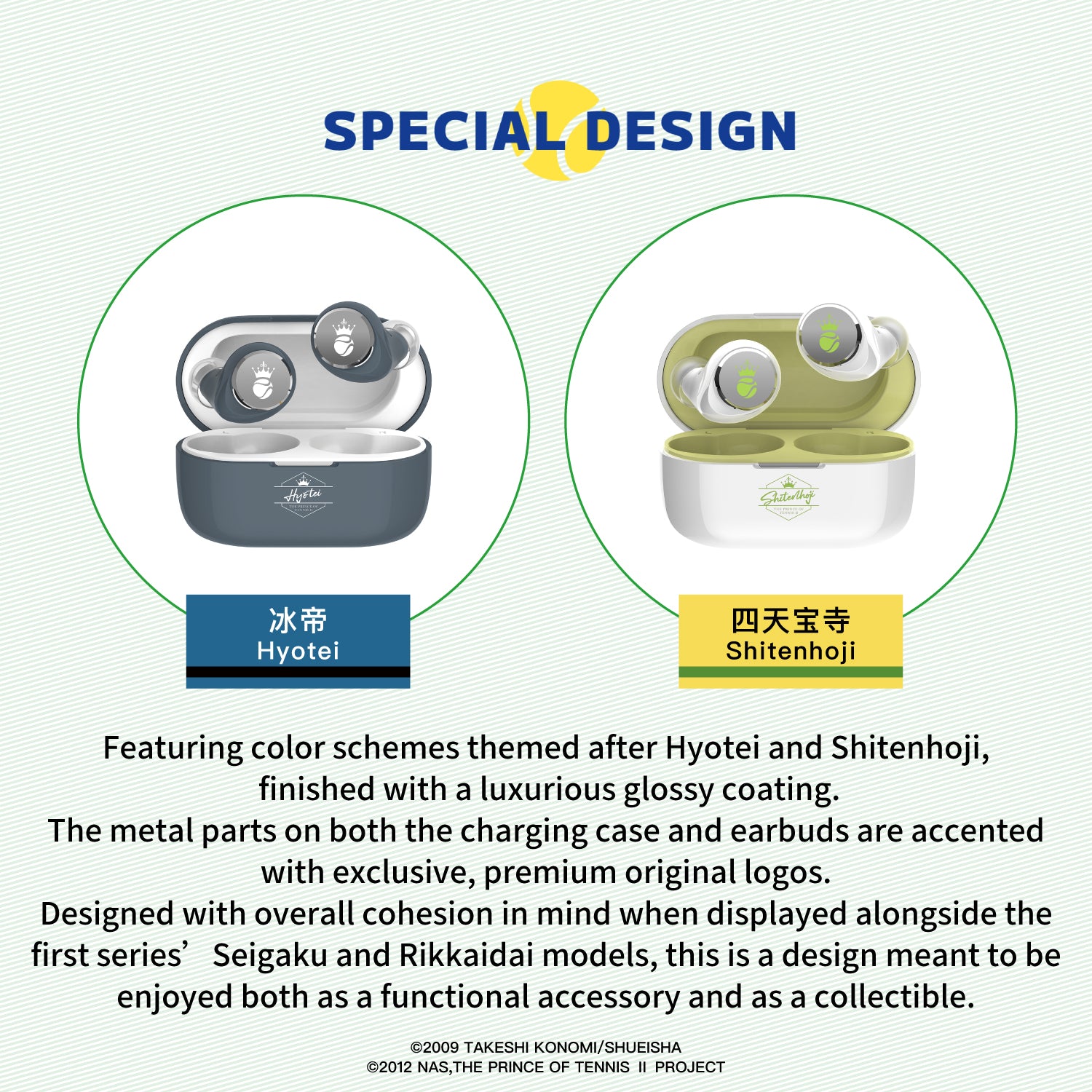 Featuring color schemes themed after Hyotei and Shitenhoji, finished with a luxurious glossy coating. The metal parts on both the charging case and earbuds are accented with exclusive, premium original logos.